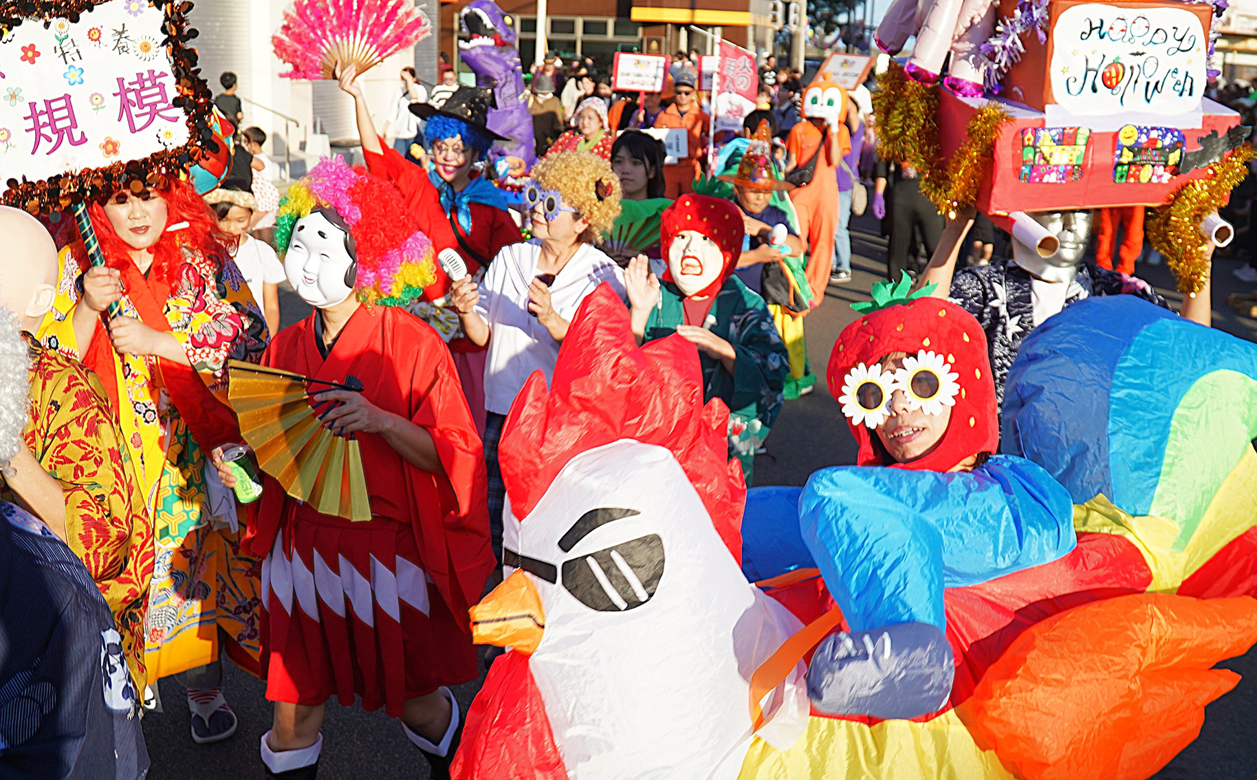 【徳之島】第42回徳之島町どんどん祭り(同実行委員会主催)のフィナーレを飾る本祭が26日、徳之島町亀津新漁港を主会場にあった。呼び物の亀津市街地パレードには「ハロウィン」をテーマに22団体・約960人(主催者発表)が参加。色鮮やかな仮装や踊り、パフォーマンスで沿道を盛り上げた。夜にはステージイベントや花火大会が行われ、秋の夜空を彩った。