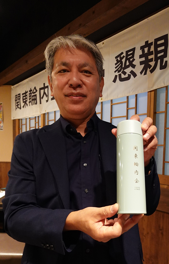 懇親会では、ジャンケン大会があり、会長の仕事つながりで金属加工業の㈱ティスの技術で「関東輪内会」と印字された魔法瓶水筒が景品として提供された。