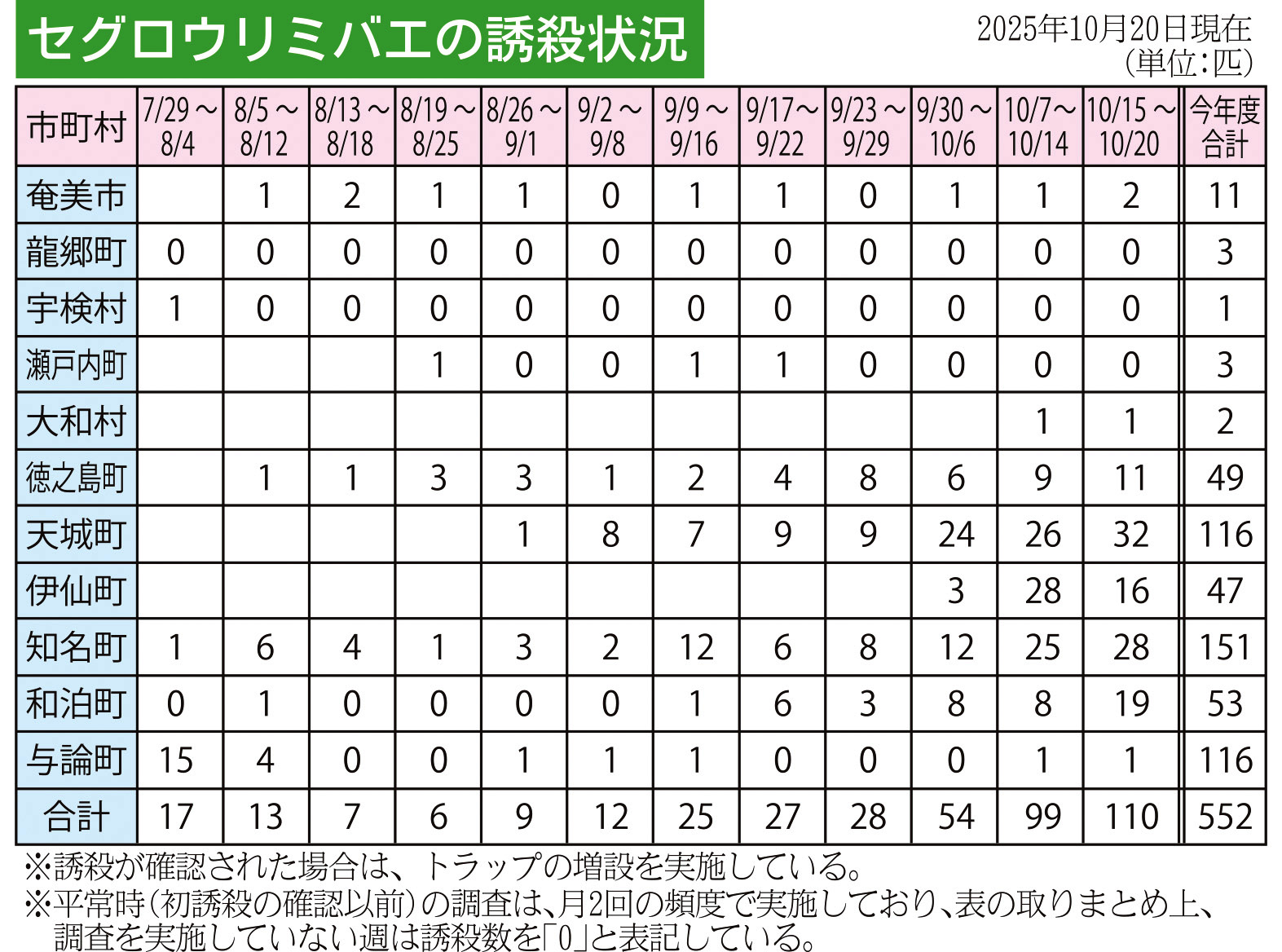 今年度の合計を市町村別にみると、100匹超は、最多の知名町(151匹)に続き、116匹で同数の天城町と与論町。この3町計は383匹で、全体の69・38%と7割を占める。今年度当初は緊急防除が行われている沖縄県に近い与論町での誘殺が目立ったが、このところ多いのは知名町と天城町で、最新週(知名28匹、天城32匹)とその前の週(知名25匹、天城26匹)では天城町の方が上回った。