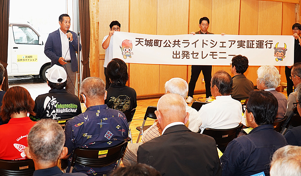 天城町の出発セレモニーは関係者約40人が参加して町防災センターであった。祷清次郎副町長はあいさつで「徳之島でもタクシーの運転手不足などによる交通空白地、高齢者など買い物弱者が増加。実証運行にあたってはPRが大事」とも強調。実証運行の概要説明に続き、利用セレモニーでも期待を寄せ合った。