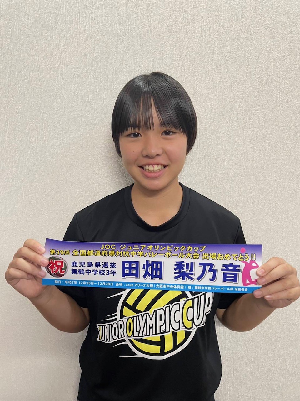 12月に大阪市などで開かれる「JOCジュニアオリンピックカップ 第39回全国都道府県対抗中学バレーボール大会」の県選抜(女子)に、奄美市名瀬の朝日小学校出身、朝日JVCに在籍した舞鶴中(霧島市)3年、田畑梨乃音(りのん)(14)が選ばれた。「県代表に選んでいただき大変うれしい。これも奄美で過ごした4年間のおかげ」と話している。