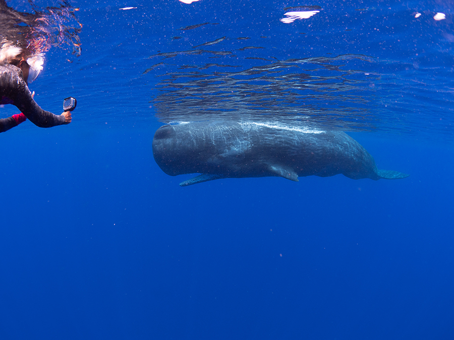 その後も調査や試験的なマッコウスイム(シュノーケリングによる海面からの観察)ツアーを実施し、年間を通して一定数が確認されたことから、23年から本格的なスイムツアーをスタート。