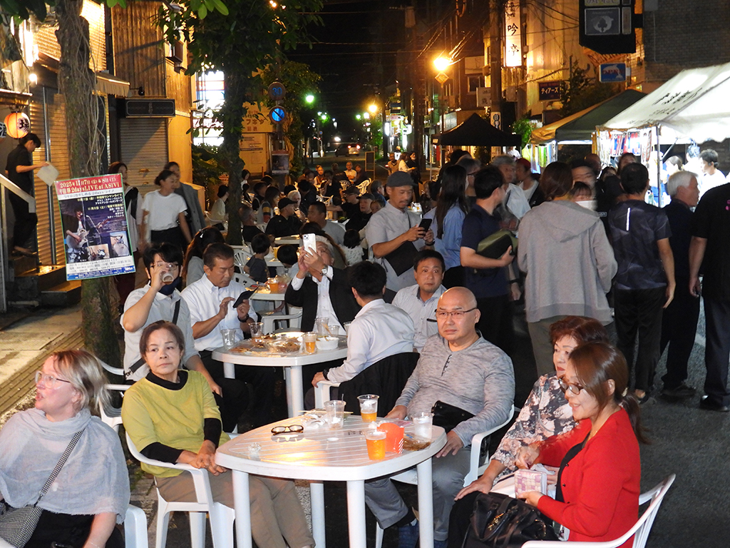 秋の夜長をやんごで楽しんで――。奄美市社交飲食業組合(里原あけみ理事長、会員84店舗)主催の「やんご祭り2025」が6日夜、奄美市名瀬の屋仁川(通称=やんご)通りであった。歩行者天国となった会場には、子どもや家族連れ、高齢者も来場。黒糖焼酎やジュースを片手に、歌や踊りのステージを楽しんだ。