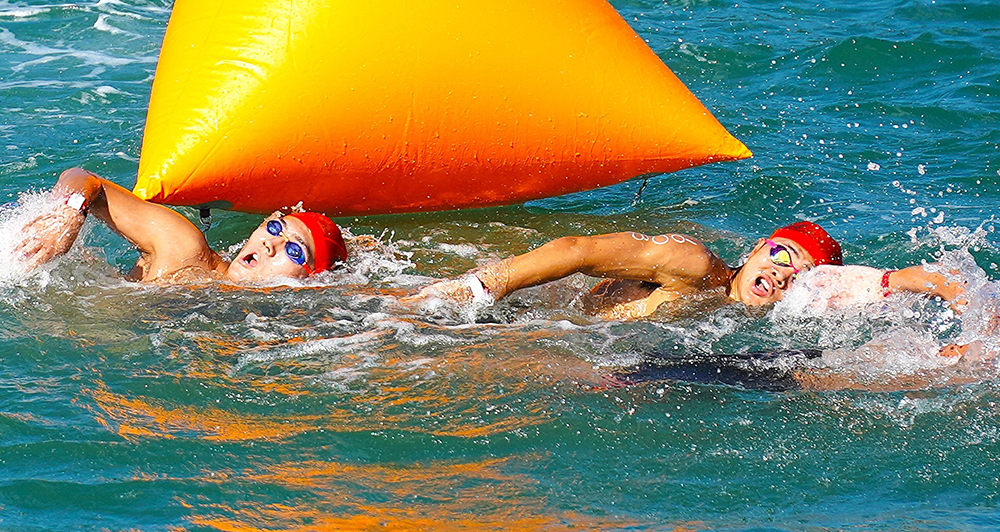 初日は秋晴れ。水温24・1度、気温25・8度、波穏やかな漁港泊地を舞台に周回500㍍の特設コース20周で争われた。午前9時、福宏人教育長の激励後に一斉スタートし、持久力と駆け引きが交錯する“海のマラソン”を繰り広げた。