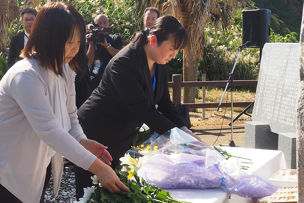 事件当時、多くの遺体が奄美大島へ漂着し、船越海岸では地元住民が救護活動や埋葬にあたった。地元集落の要望により2017年、慰霊碑を船越海岸に建立。同記念会の訪問は同年以来2回目だという。