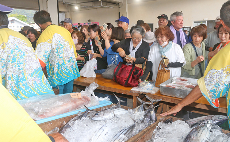 池田代表(64)によると、祭りに備えて木曜日ぐらいから取り組み、約20隻が水揚げに協力したという。並んだのはイセエビ、赤ウルメ、カツオ、エラブチ、スズメダイ、マンビキ、ネバリ、ハージン、マベ貝柱、ソデイカなどさまざまな魚介類。大勢の来場者が次々と購入していった。