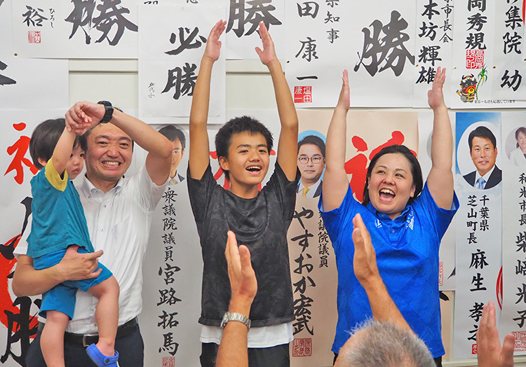 無投票での再選が確定し、家族4人が笑顔で万歳三唱 (9日午後5時半頃、奄美市名瀬)