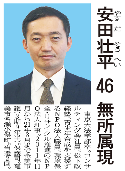 安田氏は今年6月の市議会定例会で「自然・人・文化が紡ぐ“しあわせの島”を実現するために、これまでの計画を実行していくことが私に課せられた使命である」と2期目を目指して立候補を表明。「明るくやさしく風通しのよいなつかしい未来都市・奄美市」をビジョンに▽かせぐ地域づくり▽まもる地域づくり▽育てる地域づくり▽身近で頼りになる基盤づくり▽新しい課題への対応―を公約に掲げた。