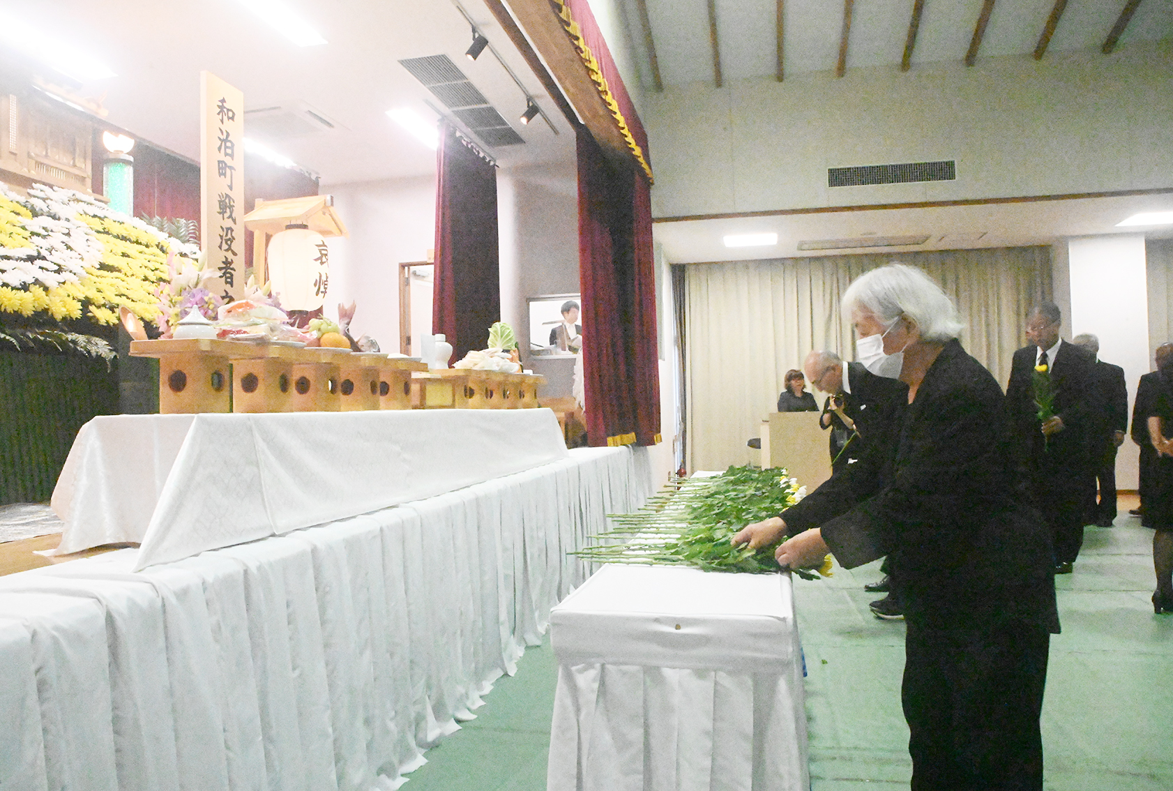 同町遺族会の大脇克子会長は「過去の悲惨な戦争と深い悲しみ、平和に対する切なる思いを次の世代に語り継いでいくことこそ私たちの義務であり、責任だ」と追悼の言葉を述べた。