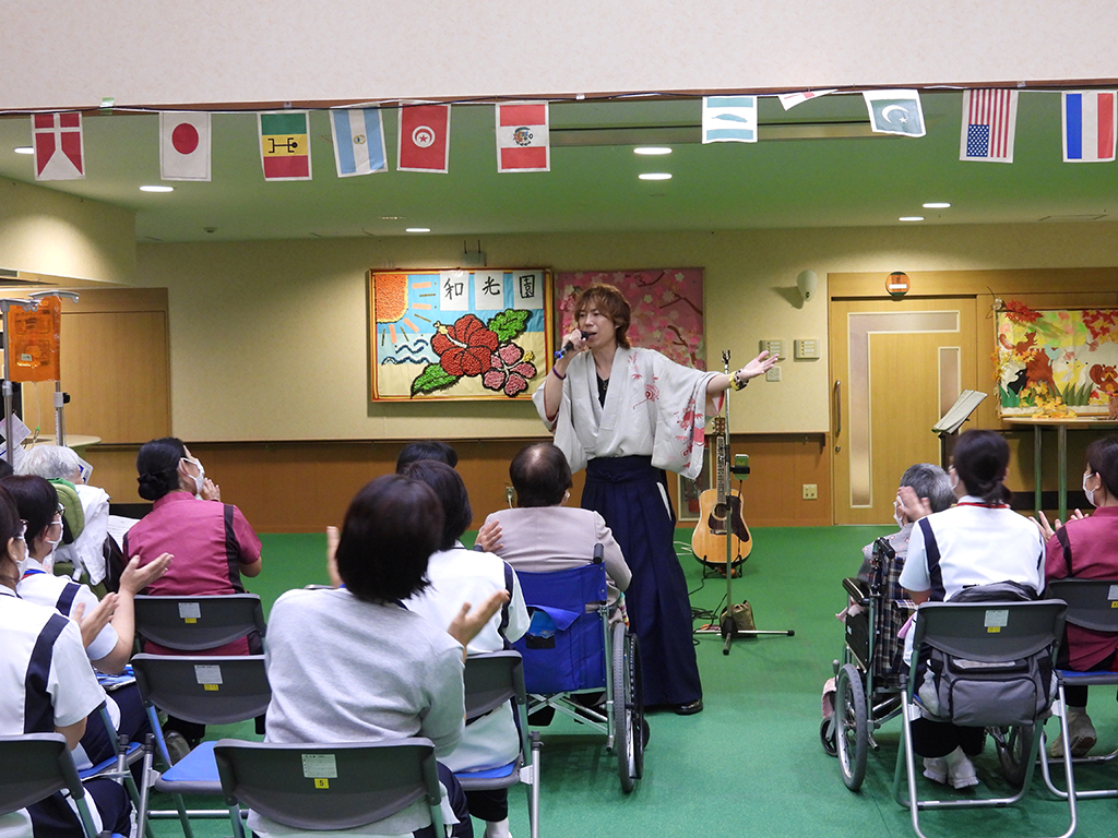 奄美市名瀬の国立療養所「奄美和光園」(馬場まゆみ園長)で14日、コロナ禍後初となる「ホスピタルライブ」があった。娯楽室の特設会場で入所者、職員ら約40人が鑑賞。〝歌う坂本龍馬〟として、全国の病院や福祉施設で4000回以上ライブ活動をしてきたというシンガー・ソングライターの松尾貴臣さん(千葉県)のやさしい歌声に聴き入った。