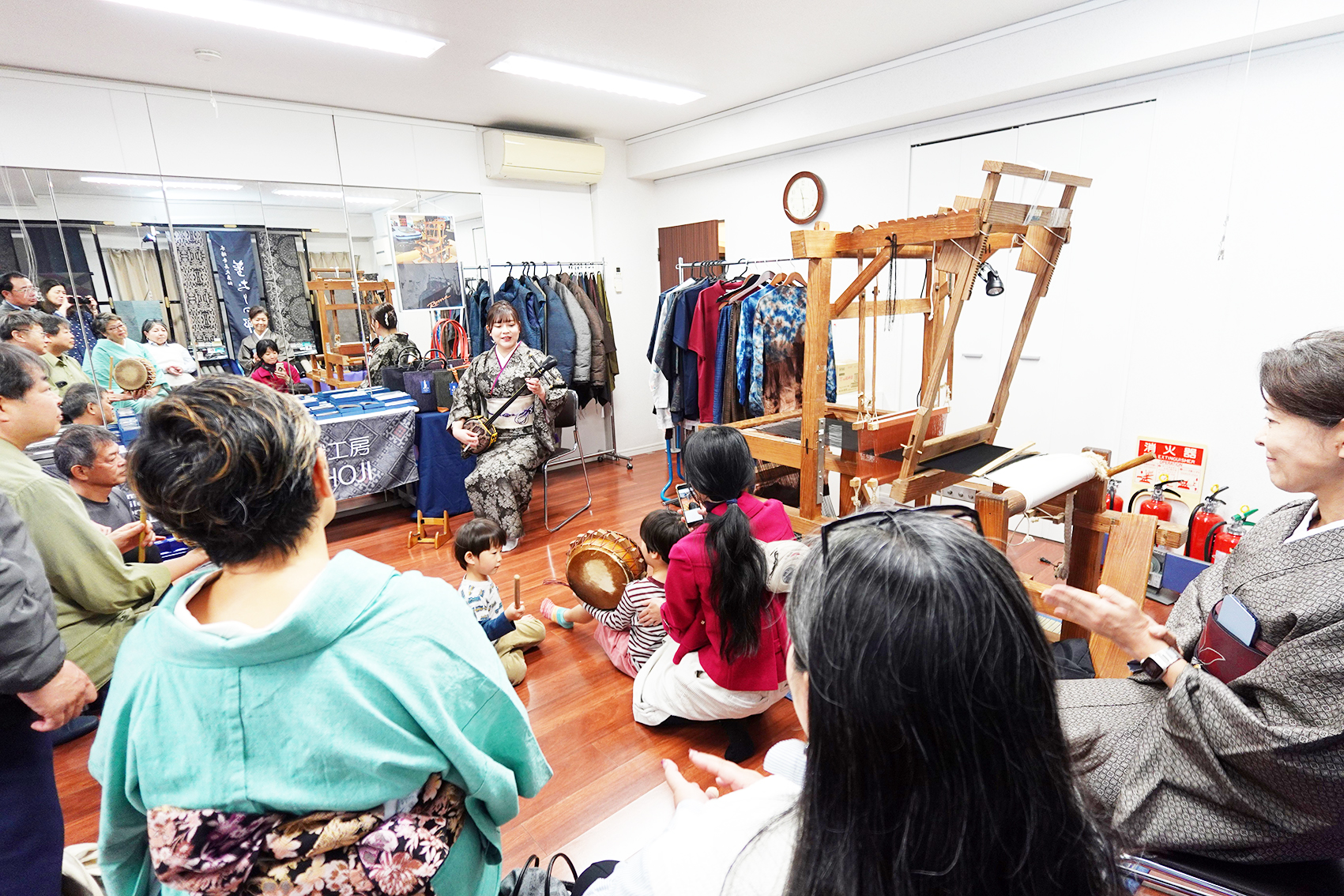 【東京】本場奄美大島紬販売協同組合では1、2日、吉祥寺のアカデミア吉祥寺plusで大島紬フェアを開催した。第2回目となる今回は機(はた)織り機も会場に設置し、機織り体験も。販売協組からははじめ商事の元允謙(ただあき)さんと夢おりの郷の南晋吾さんが上京、また平田まりなさん(29)のシマ唄ライブも開催され、着物ファンやシマ唄ファン、奄美ファンでにぎわった。