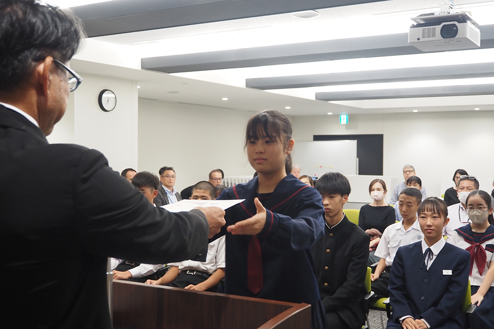 親善大使として任命証を受け取る派遣生