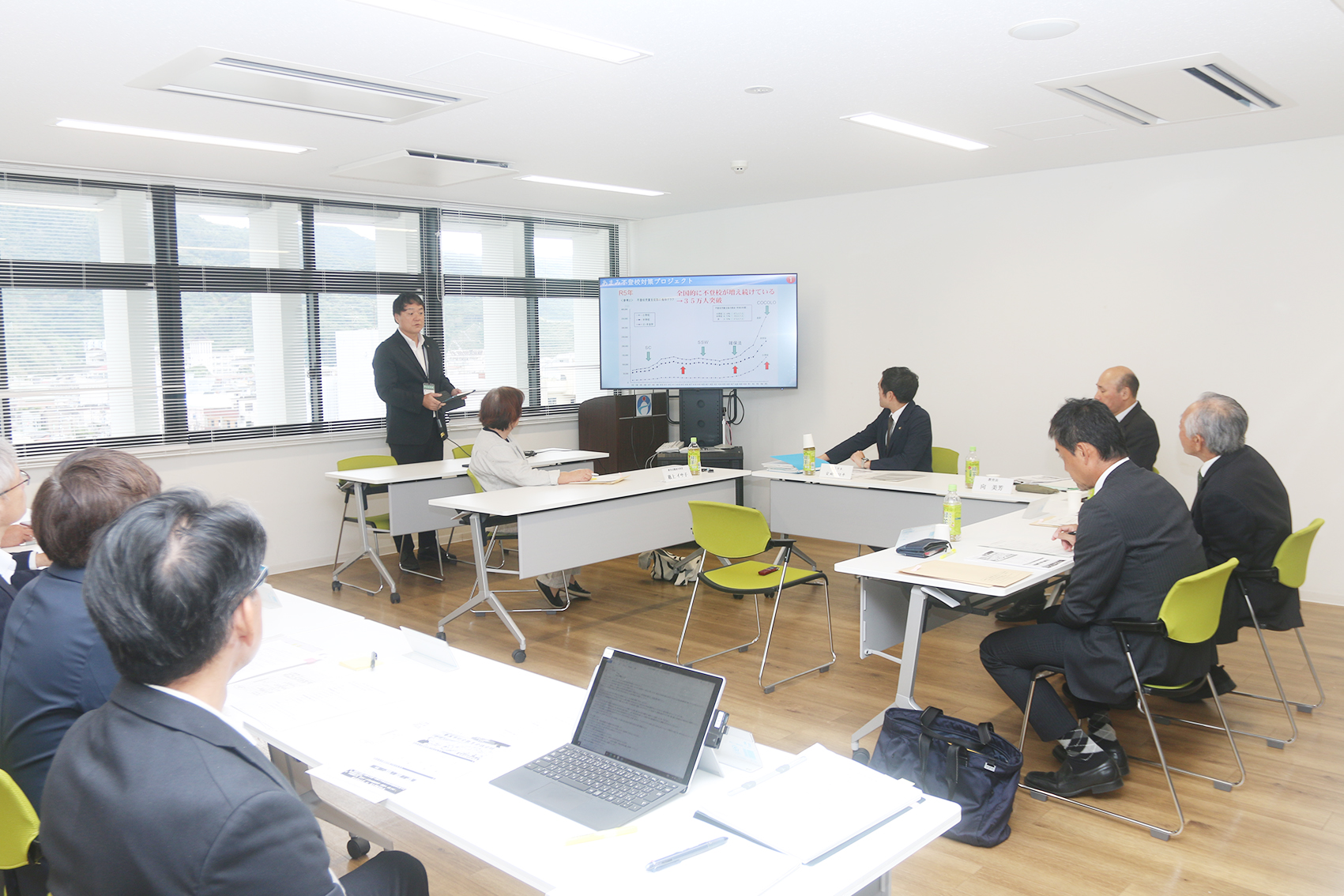 不登校対策プロジェクトの取り組みは担当する市教委学校教育課の長岡哲仁・主幹兼指導主事が報告。それによると、今年度の不登校数(7月30日段階)は小学校36人(前年度同期比9人増)、中学校45人(同27人減)。2学期に入っての10月段階では小中ともさらに増加しているとして、「継続的な取り組みが大切」とするとともに、子どもを簡単に休ませる保護者が増えているとした。
