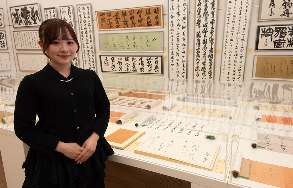 原さんは大島高校在学中に、クラブ活動を通して書に出会った。展覧会出品を重ねていくうちに、負けず嫌いという性格が功を奏して高校総合文化祭では鹿児島県代表で出場。大学進学を決める時にたまたま参加した大東文化大学のオープンキャンパスで、「直感でここがいいと思った」という。