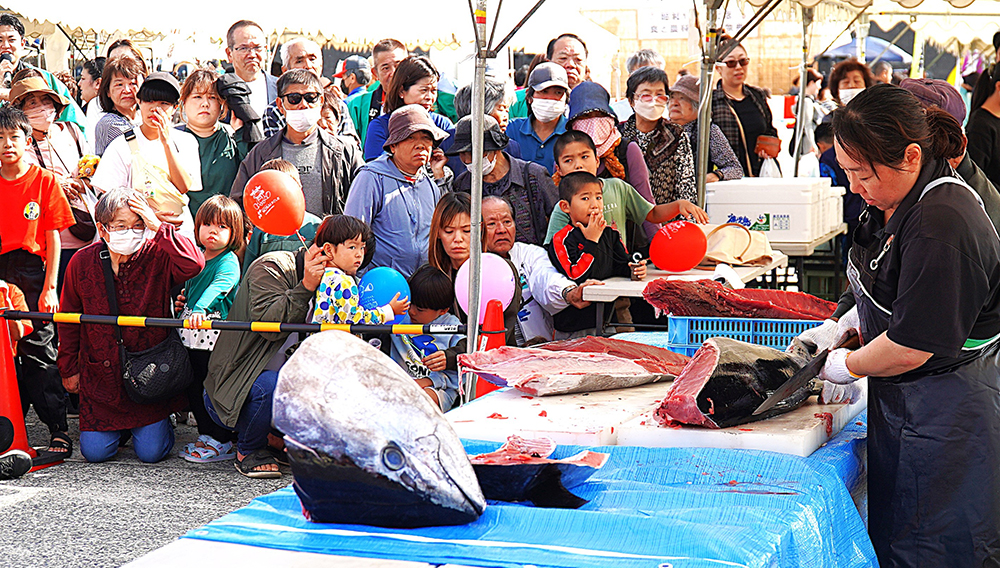 目玉企画の一つ、同町漁業集落による「マグロ解体ショー」には、今年も大勢の観客が詰めかけた。解体披露された53㌔を含む52㌔との2匹の本マグロ(クロマグロ)から切り出した刺身約300食分が無料で振る舞われ、列が途切れない人気ぶりだった。