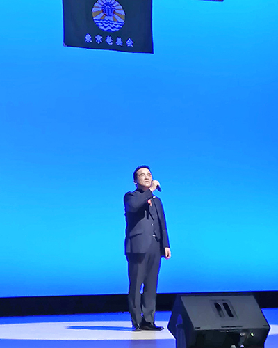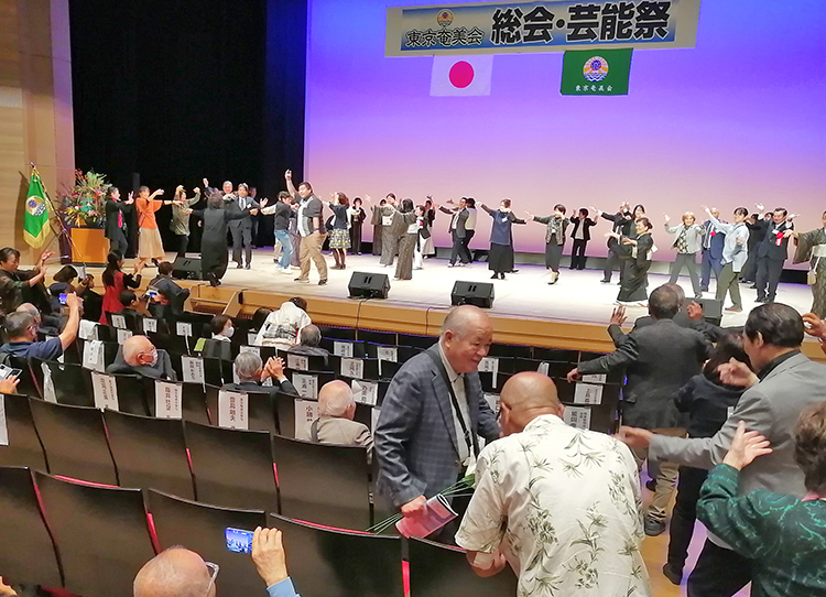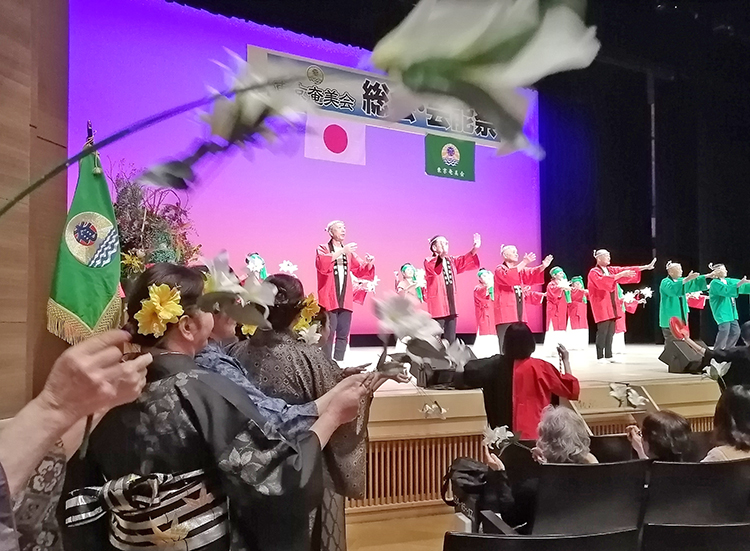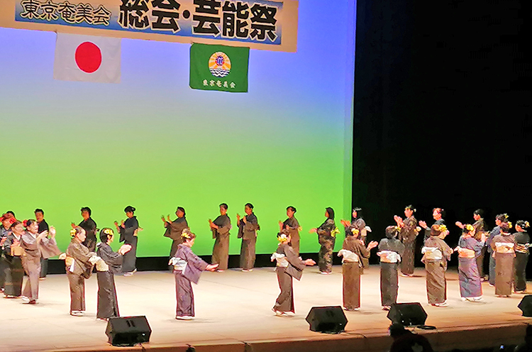 郷土遥拝、萩原かおりさん(昭和音楽大学教授)の先導で参加者による「東京奄美会会歌」がホールに響いた。江浪まつみ事務局長の司会で総会が開幕。晴れ晴れとした表情で宮地会長があいさつ。「奄美に生まれて本当に良かったと思えるよう、共に唄い、踊り、大いに楽しもう」と語り掛けた。次期会長には、引き続き宮地さんが選出された。「何ができるか、お楽しみに」と新会長は笑顔で意気込んだ。