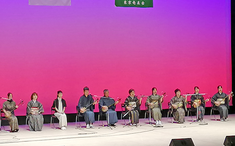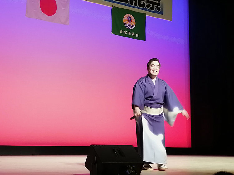 その後、八波一起さん、あずままどかさんの司会で芸能祭へ。牧岡奈美さん、森田美咲さん、藤田晶さん、東京山ゆり会が祝い唄を熱唱、伊是名の会は幻想的な世界観を表し、盛んな拍手を浴びていた。東京奄美会女性部が合同で舞踊を披露、沖洲会・与論会は「永良部百合の花」に躍動した。四代目・三遊亭圓歌さんは、抱腹絶倒の高座で場内を笑いで包んだ。