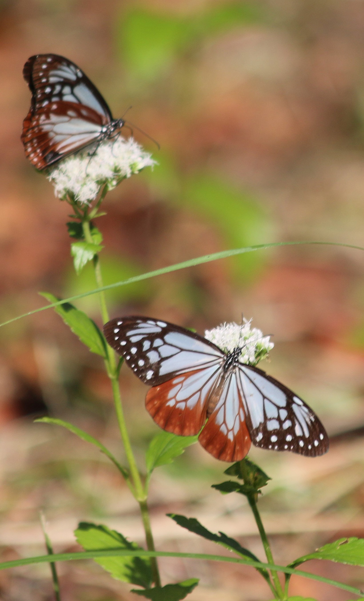 龍郷町の長雲峠では、奄美自然観察の森に通じる町道でヤマヒヨドリバナ(吸蜜植物)が草刈りされずに残っているため、花を目指して飛来する多くのアサギマダラが観察できる