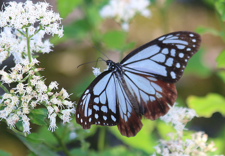 龍郷町の長雲峠では、奄美自然観察の森に通じる町道でヤマヒヨドリバナ(吸蜜植物)が草刈りされずに残っているため、花を目指して飛来する多くのアサギマダラが観察できる