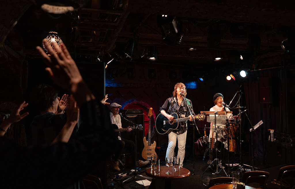 1部は築さんのソロ。オープニングは代表作の「やってみろよ」でシャウトし、ロック、バラード、フォーク調と多様な曲で盛り上げた。2部は「ittyariイッチャリ」のステージ。佐久間啓市さん(53)がベース、ギター、ボーカルを担当。武田さんはジャンベをメインにパーカッションとメインボーカル。西アフリカギニアのトラディショナルソング「ディンマー」でスタートした。「マブリ~トゥディナサ」「月の時間」など、ネリヤカナヤ時代の名曲も交えながら「ルイジアナママ」をもじった「シマンチュママ」、「ラ・バンバ」など、にぎやかな曲で会場を沸かせた。