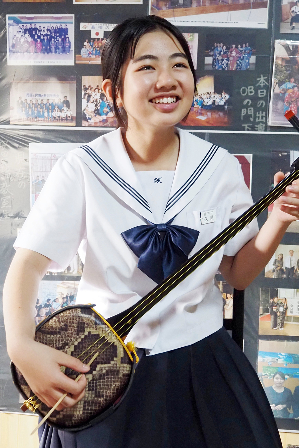 久原さんは、喜界町池治にあるシマ唄教室「安田民謡教室」の生徒。小学3年生の時、校内放送で唄っていた先輩唄者の川畑さおりさんに憧れ、教室に通い始めた。教室では、安田末子さん、井(わかし)実加さんに師事。2023年には、小中学生が競う民謡民舞全国大会に出場し、小学生4~6年の部で日本一にも輝いている。