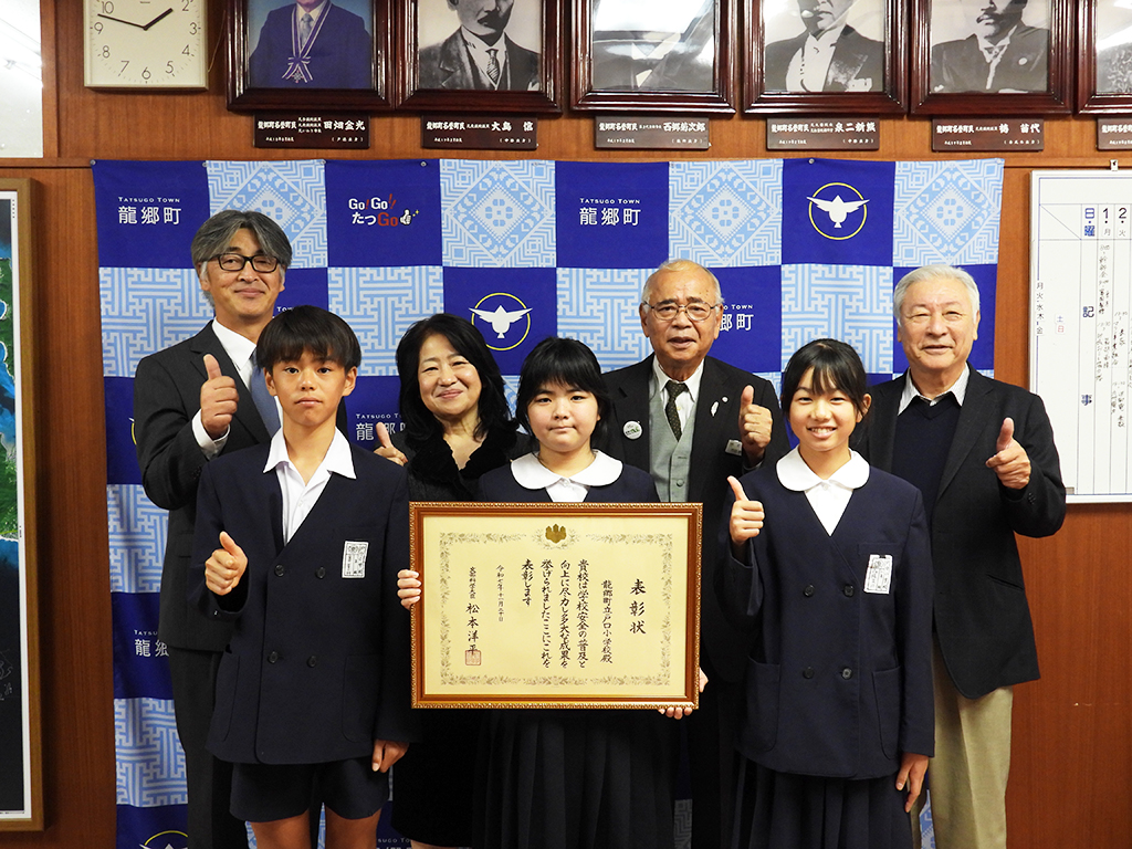 龍郷町の戸口小学校(森智子校長、児童32人)が2022年度から取り組んできた「命を守る行動が取れる子どもの育成」をテーマとした防災教育が10月、文部科学大臣賞に選ばれた。森校長らと児童3人は26日、竹田泰典町長を表敬訪問、受賞を報告した。