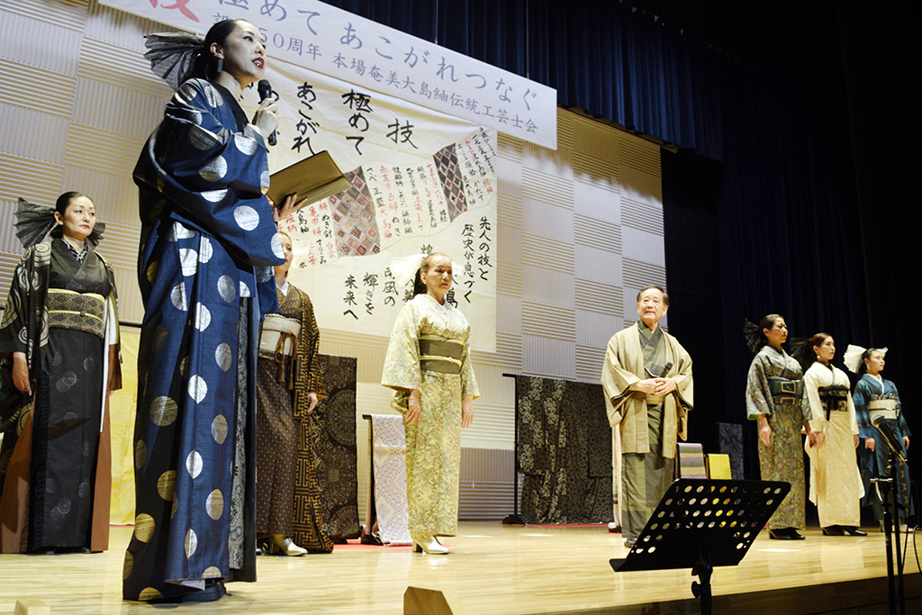 本場奄美大島紬伝統工芸士会(南祐和会長)の創立50周年の記念イベントが29日、奄美市名瀬のアマホームPLAZAであった。会員や来賓、関係者ら約200人が出席し、半世紀の節目を祝福。セレモニーや講演、ファッションショーなどの多彩な催しを通じて、技を紡いできた先人たちに感謝し、次世代の技術継承に誓いを新たにした。