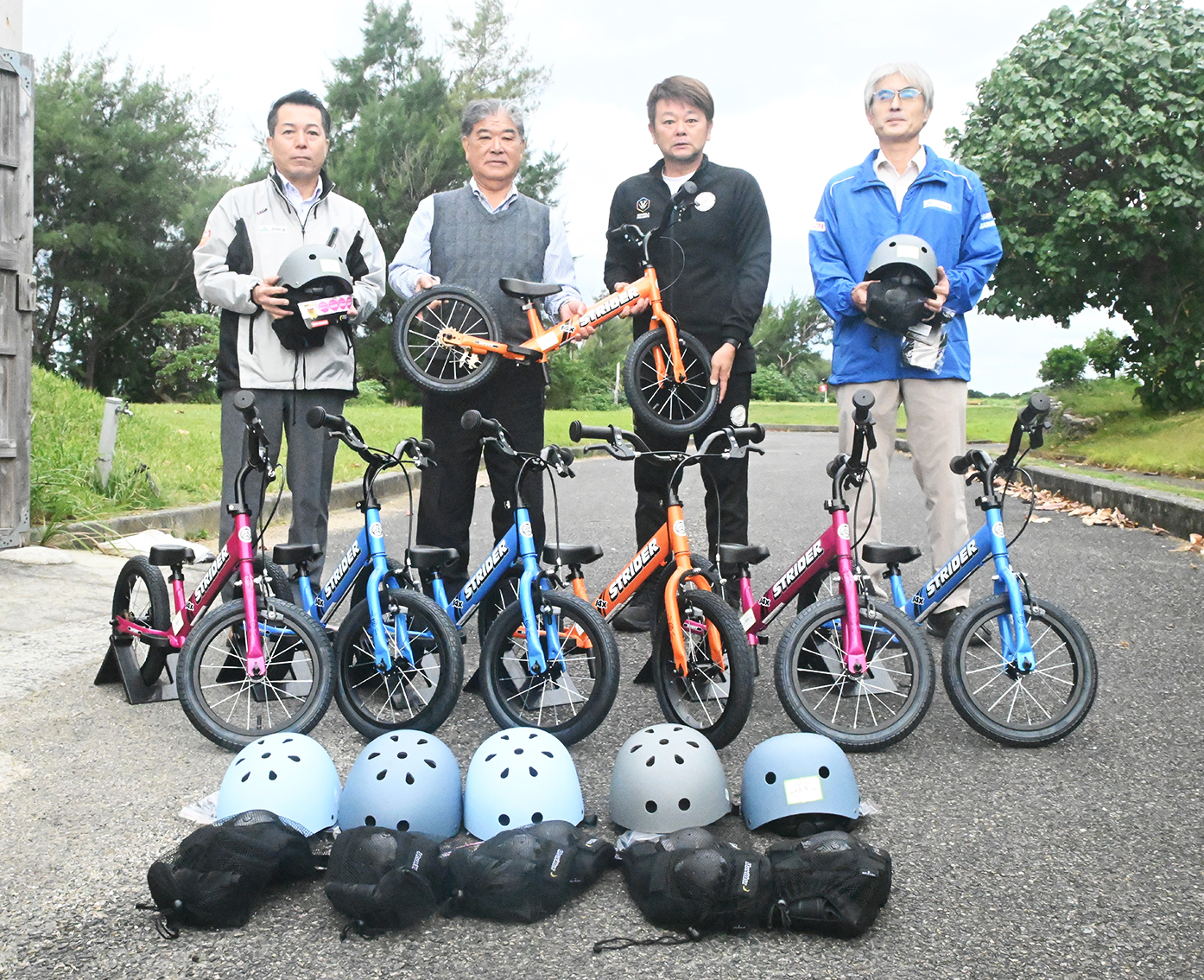 今回、キックバイクのほか、ヘルメットとプロテクターもそれぞれ七つずつ寄贈した。