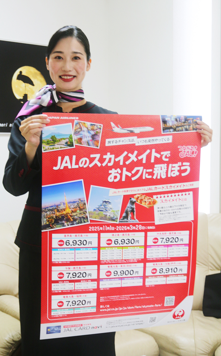 奄美営業所の横大路俊博副所長は「奄振交付金も活用できたことで、昨年からここまで安い料金帯で提供できている。学生の皆さんの帰省利用だけでなく、地元・奄美からも東京や大阪旅行などで利用してもらいたい。3月まで利用でき、卒業旅行にも役立つのではないか」とスカイメイト利用を呼び掛ける。11月からの開始だが、同月は昨年の倍の予約数となったという。JALふるさとアンバサダーとして同営業所で勤務する吉福瑠璃子さんは「スカイメイト同士みんなで利用して、(運賃の安さから)わくわく感で旅行が楽しめるのでは」と語った。