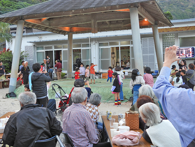 奄美市名瀬根瀬部(武原末明区長、84世帯、125人)で11月30日、集落総出の秋祭りがあった。100人以上が集った祭りの主役は子どもたち。テナガエビ釣りに興じ、ステージに見立てた土俵の上で歌い踊る姿を、温かく見守る大人たちにほのぼのとした空気が漂った。