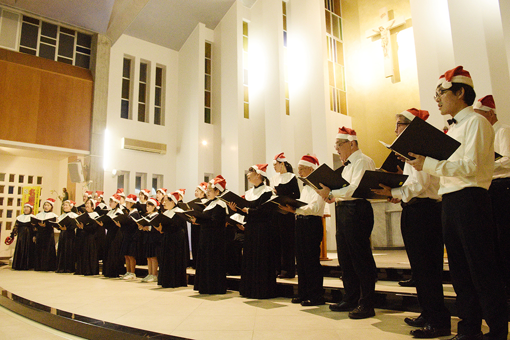 名瀬市民合唱団(中村恵美子団長、団員42人)50周年記念のクリスマスコンサートが14日、奄美市名瀬のカトリック名瀬聖心(みこころ)教会であった。サンタ帽をかぶった団員30人は、讃美歌やクラシック、ポップスなどのクリスマスにちなんだ13曲を多彩に披露。厳かな礼拝堂に、聖夜の歌声を響かせた。
