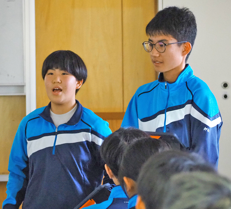 同級生を前に、北方領土視察の体験などについて講話した、高姫花(ひめか)さんと押江竜聖さん
