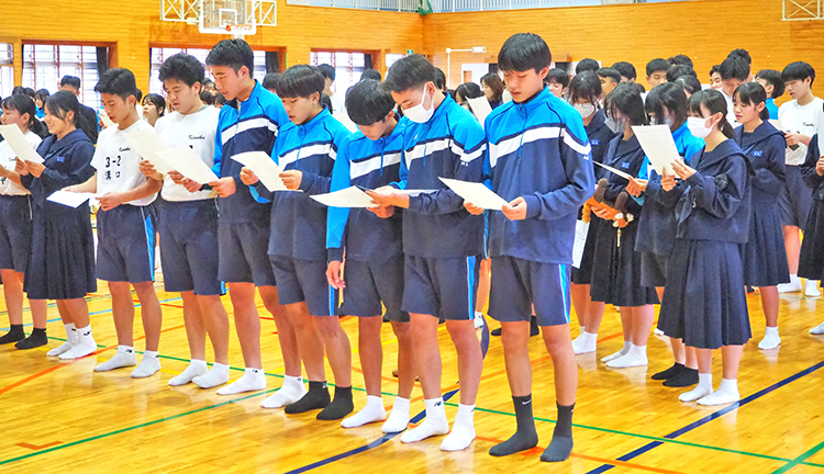 奄美市名瀬の金久中学校(当田進一校長、生徒240人)の総合的な学習の時間「日本復帰学習」が19日、同校体育館などであった。生徒たちは、奄美群島日本復帰の歴史や他地域の現状を学ぶとともに、戦争や紛争など平和的に解決する方法について考えた。2年生による講話では、講師を務めた同級生、高姫花(ひめか)さんと押江竜聖さんから「次の社会をつくるのは私たち」と歴史を継承する強いメッセージが伝えられた。