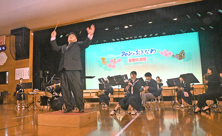 【沖永良部】第29回ヨロン・おきなわ音楽交流祭(同実行委員会主催)が20日、与論町砂美地来館であった。与論と沖縄から14団体193人が参加。吹奏楽やエイサー、和太鼓、バトントワリングなどで交流を深めた。