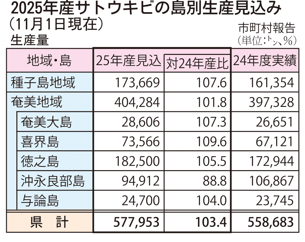 生産見込み量の島別は徳之島18万2500㌧(前年比5・5%増)、沖永良部島9万4912㌧(同11・2%減)、喜界島7万3566㌧(同9・6%増)、奄美大島2万8606㌧(同7・3%増)、与論島2万4700㌧(同4・0%増)の順。
