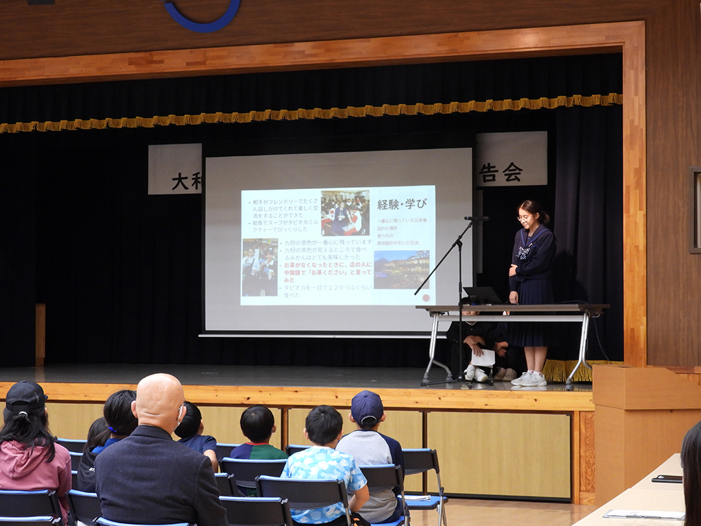 大和村の大和中学校(窪田雅彦校長、生徒27人)2、3年生を対象にした国際交流事業「台湾研修」の報告会が25日、村防災センターであった。村内4小学校の児童約40人と保護者など約100人が聴講。参加した生徒全員が、外国での同世代との交流、日本との文化・風習の違い、語学の大切さなど、初めての外国研修での学びを語った。