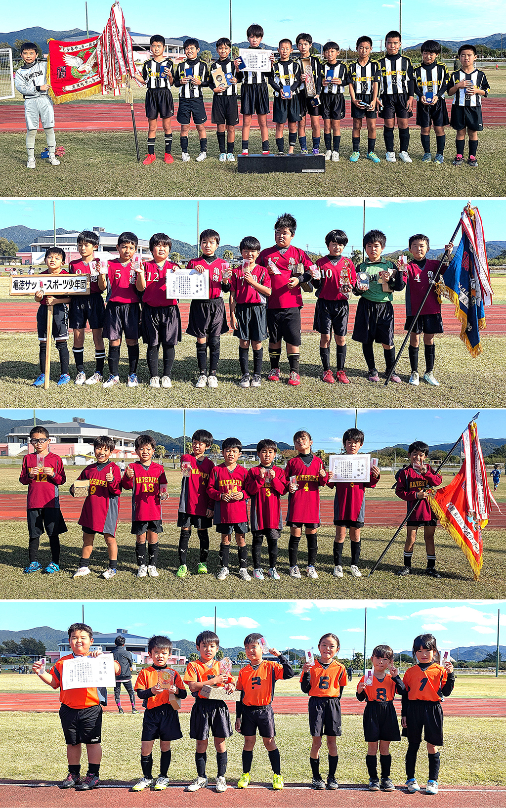 【徳之島】天城町総合運動公園で開催された第41回大島地区少年サッカー大会(同町サッカー連盟主催)は28日、2日目最終日を迎え、計4ブロックとも決勝トーナメント・リーグ戦を展開。Aブロック(最強)とD同(2年生以下)では亀津スポーツ少年団が初優勝し、2冠を達成。B同(5・6年生)は亀徳B、C同は宇検マテリヤCがそれぞれ栄冠に輝いた。