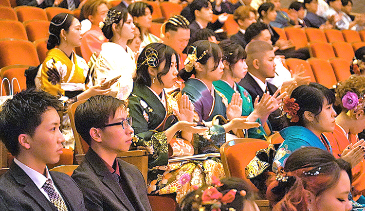 【徳之島】徳之島3町の2026年「二十歳のつどい」(各町教育委員会など主催)が2日午後、各町会場であった。新成人たちは、あでやかな晴れ着や凛々しいはかま、スーツ姿で出席。懐かしい仲間との再会に笑顔を交わし、地域関係者や家族から祝福と激励を受けながら、大人としての決意を新たにした。一方、少子化の影響を受け、3町とも対象者・出席者数は過去最少となった。