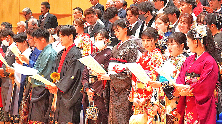 午後2時から町文化会館で行われ、対象者112人のうち78人が出席。福宏人教育長は式辞で、同町の人口減少問題(20年前1万2892人、現在9211人)に触れながらも「人口増が続く沖縄に匹敵する郷土愛や家族・親族の結びつきという強みがある。新しい視点と突破力で地域創生を担ってほしい」と期待を寄せた。