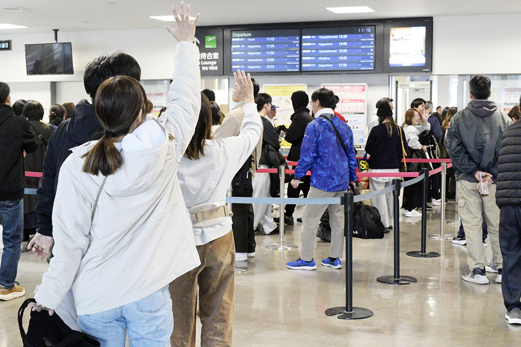 奄美空港では午前中、東京方面に向かう乗客で込み合った。空港2階ロビーでは出発前の手荷物検査に長い列ができた。連休を満喫した人からは笑顔が見られ、家族や親戚、滞在先の関係者らがお見送り。ゲート近くでは、「さようなら」「また来るね」と声を掛け合いながら、別れを惜しむ姿もみられた。