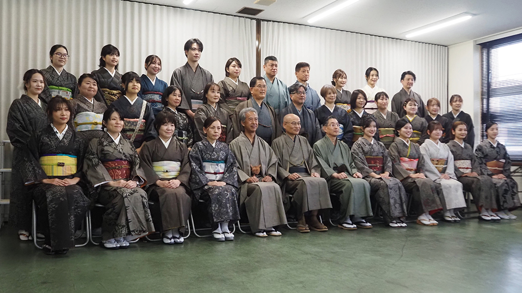 大島紬を身にまとい、記念撮影に納まる県大島支庁の職員