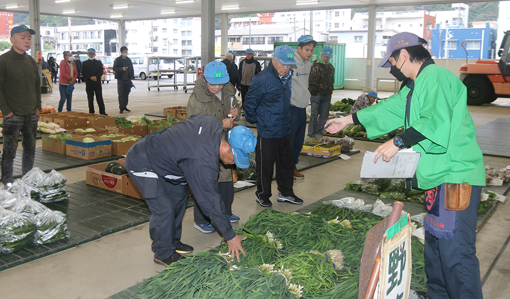 総入荷量は3938・5㌔(うち地場産2750・4㌔)、販売額は91万7千円(同64万3千円)。入荷量の内訳は全て地場産だったスターチスやキク類などの花き292・5㌔、果物1677・1㌔(同1613・1㌔)、野菜1962・7㌔(同843・6㌔)。果物も地場産の割合がほとんどを占めたが、野菜は42・97%と半分に届かず島外産地からの移入品の割合が高い状況にある。昨年初競りの入荷量は花き33㌔、果物444㌔、野菜2215・5㌔で、野菜のみ下回った。