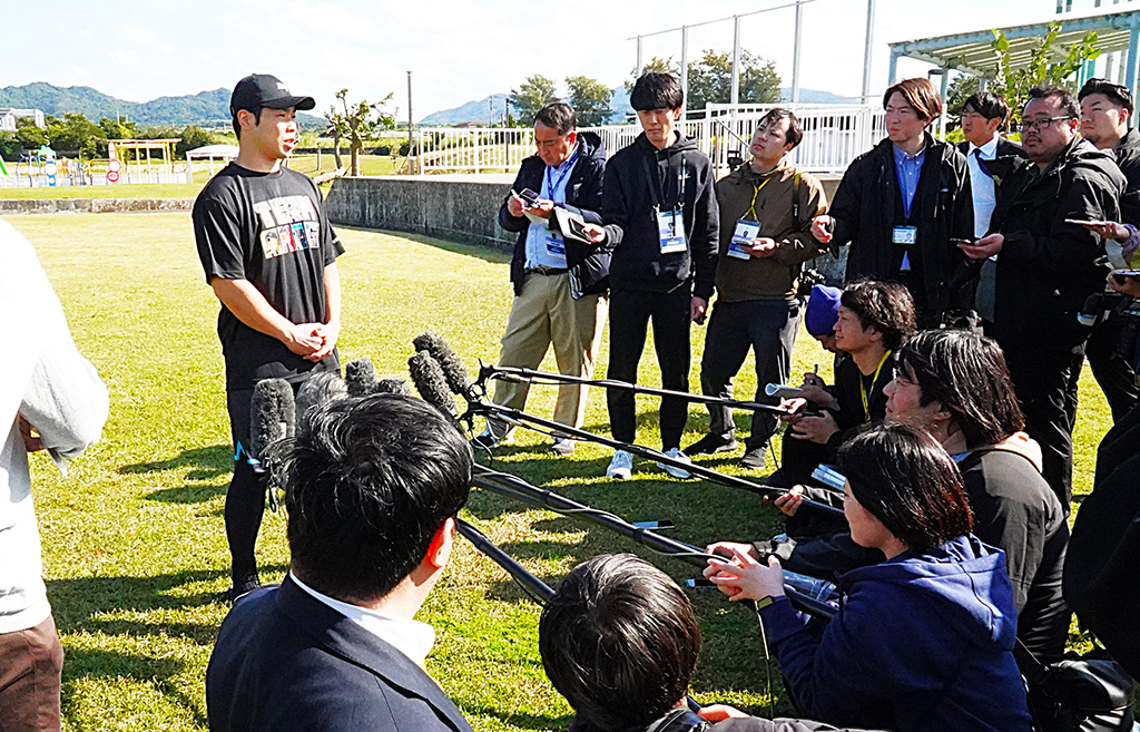 押し寄せた報道陣に前向きでストイックな姿勢で答えた近藤健介選手=9日、天城町同公園