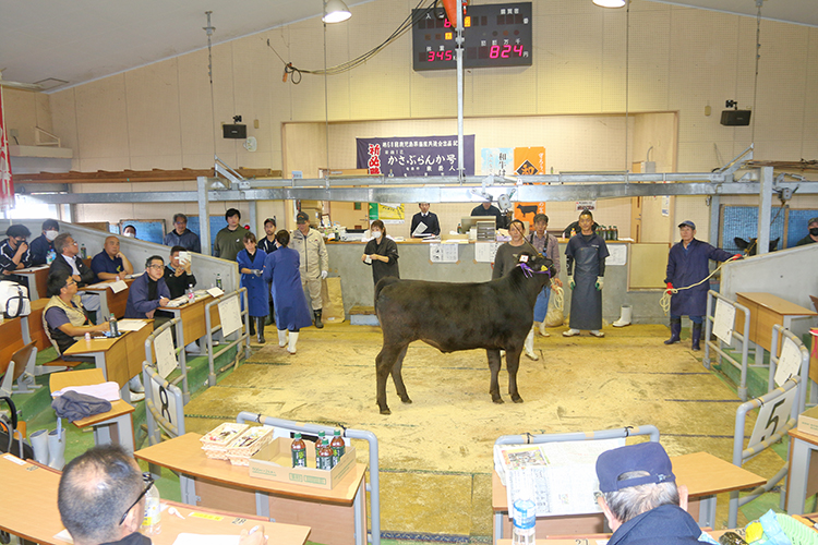 競り開始を前に地元自治体を代表して安田壮平市長があいさつ。昨年の肉用牛情勢を振り返り「子牛価格は前年と比較して高水準で推移し、繁殖農家にとって大きな支えとなった一年だった。一方で飼料価格は、ピーク時に比べ多少の落ち着きは見られるものの、枝肉価格は横ばい傾向が続いている。肥育農家は高い素牛(もとうし)価格と高止まりする飼料費の狭間で、大変厳しい経営を強いられた年でもあったと受け止めている」と述べた。市の取り組みも説明。生産基盤の整備や優良な繁殖雌牛の導入・育成、飼料自給力の向上、防疫体制の充実に努め「肉用牛の振興を図っていく」とし、初競りが今年一年の飛躍の契機となることを願った。