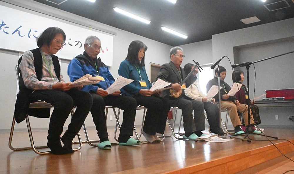 【沖永良部】知名町田皆字の方言や伝統芸能の保存継承に取り組んでいる「たんにゃむにサークル」(田邊ツル子代表)は11日、同町田皆字コミュニティーセンターで第3回「たんにゃむにのつどい」を開いた。園児からお年寄りまで幅広い年代の住民が集まり、民謡の披露や方言クイズなどで楽しんだ。