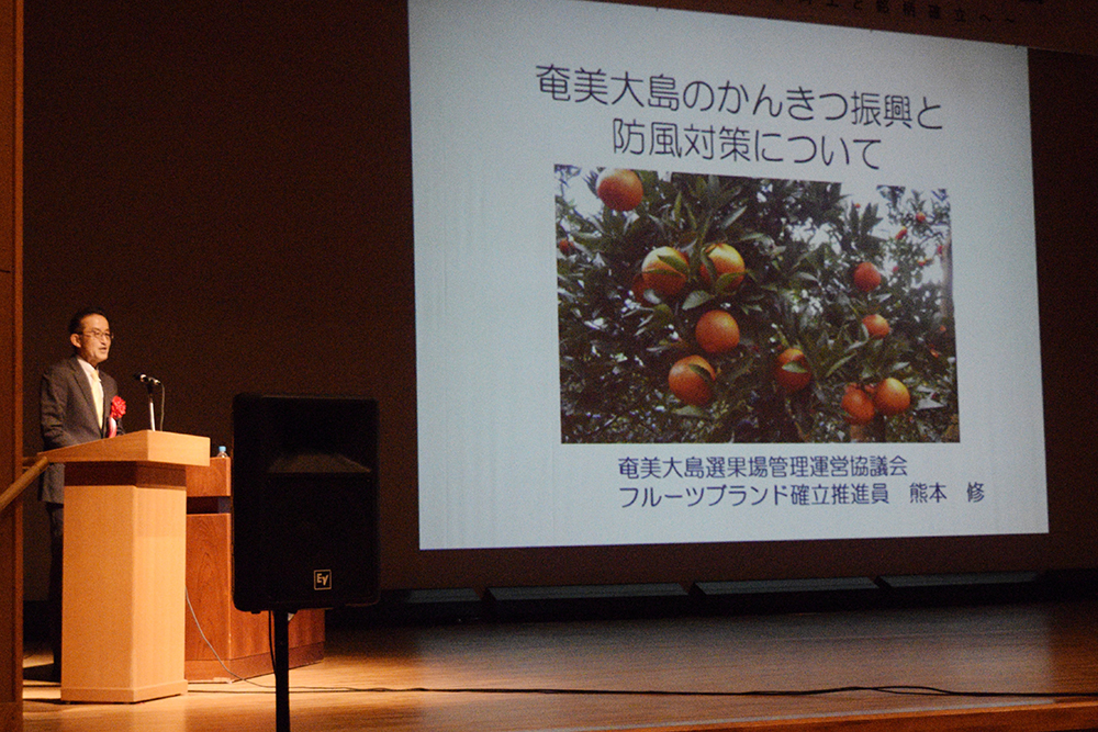 奄美大島選果場管理運営協議会フルーツブランド確立推進員の熊本修さんは「奄美大島のかんきつ振興と防風対策について」をテーマに講話し、同協議会が進める「あまみフルーツアイランド事業」の事業概要を報告。台風の襲来が減少する近年で、おろそかになりつつある防風樹の必要性も伝え、「奄美地域は台風の常襲地帯。果樹栽培には、防風樹の整備は大前提だ」と訴えた。
