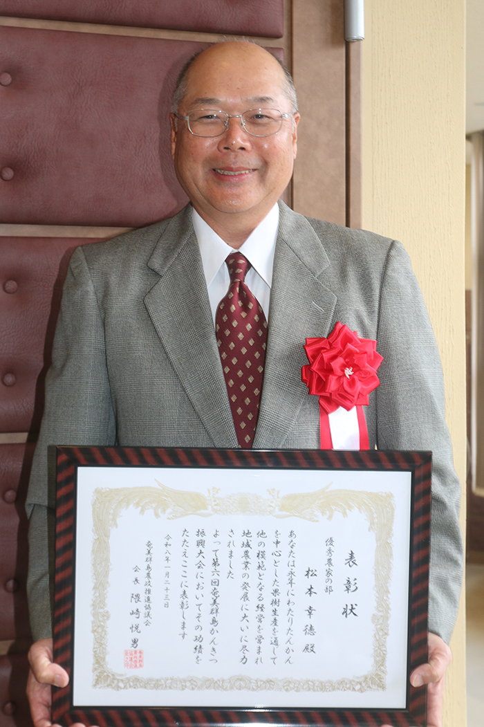 大会功労者等表彰で松本さんは優秀農家部門で受賞。表彰理由は、県の指導農業士として果樹の栽培技術指導などを通じた後継者育成に加え、徳之島町柑橘(かんきつ)生産組合及びJAあまみ徳之島地区果樹部会の役員(会長)として部会活動に積極的に取り組んでいる点。身に付けている高い栽培技術を若い農家に継承。地域農業を担う後継者の確保・育成や生産部会活動の活性化に取り組んでおり、果樹産地の発展に貢献している。