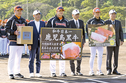 奄美市からは奄美近大本マグロ1匹、県からは鹿児島黒牛25㌔、ホテルサンデイズ奄美からは天然アルカリ温泉水・財宝が激励品として贈られた。
