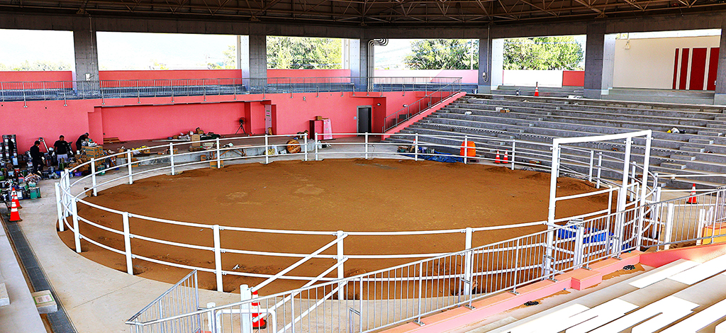 町総合運動公園(浅間)の東側隣接(町有地)に位置し、施設規模は鉄筋コンクリート2階建て(延べ床面積2490・26平方㍍)。設備の内訳は、▽闘牛場(収容人員約3千人、闘牛リング直径20㍍、正面ステージ設置)▽自然伝統文化体験コーナー(87・2平方㍍)▽農産物直売コーナー「空の駅」(161・7平方㍍)など。