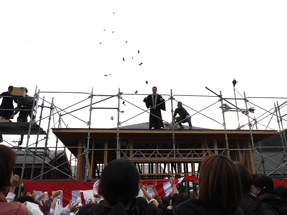 午後5時から行われた棟上げ式は、寺を利用する人や近隣住民、小学生らが集まりにぎやかに行われた。成田住職(57)、妻で僧侶の小百合さん(45)、長女の3人が屋根の上から餅やお菓子をまくと、子どもたちは笑顔で拾い集めていた。